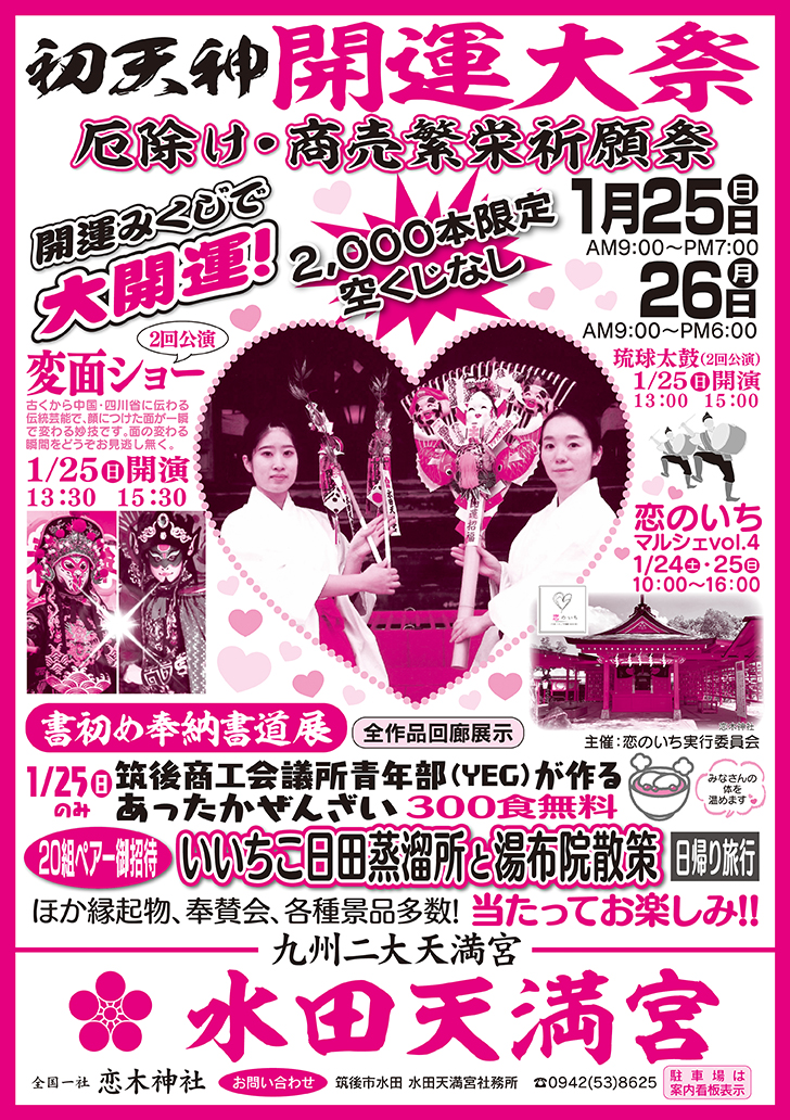 ●1月25・26日 初天開運大祭(案内) ●奉納書初め展 ◎学業合格・厄除け・商売繁盛祈願随時受付 |