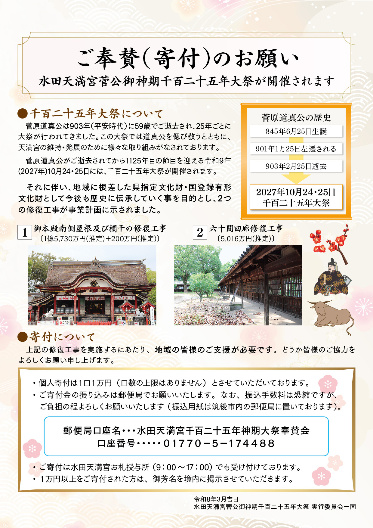 ![]() 水田天満宮社務所 〒833-0027 福岡県筑後市水田62番地の1 TEL:0942-53-8625/FAX:0942-53-8862 |